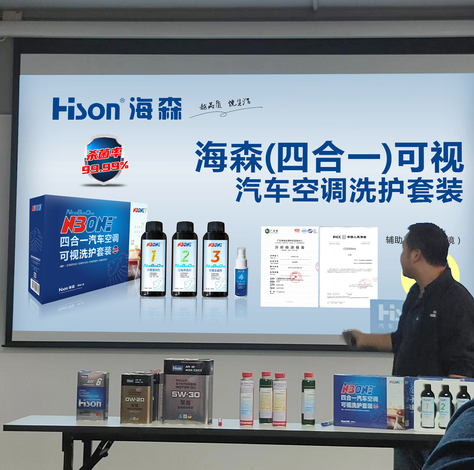 海森技术部负责人作新产品的功效说明:燃油车的动力系统的除碳及免拆治理烧机油项目与汽车空调可视洗护项目。